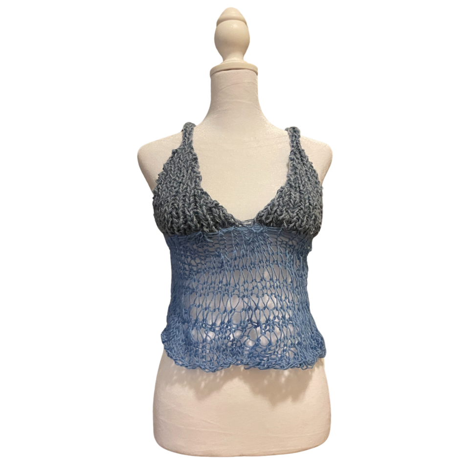 sunshine and blue skies with this tank top! featuring a dynamic blend of blue wool and cotton yarn. this piece took approximately 8 hours to complete