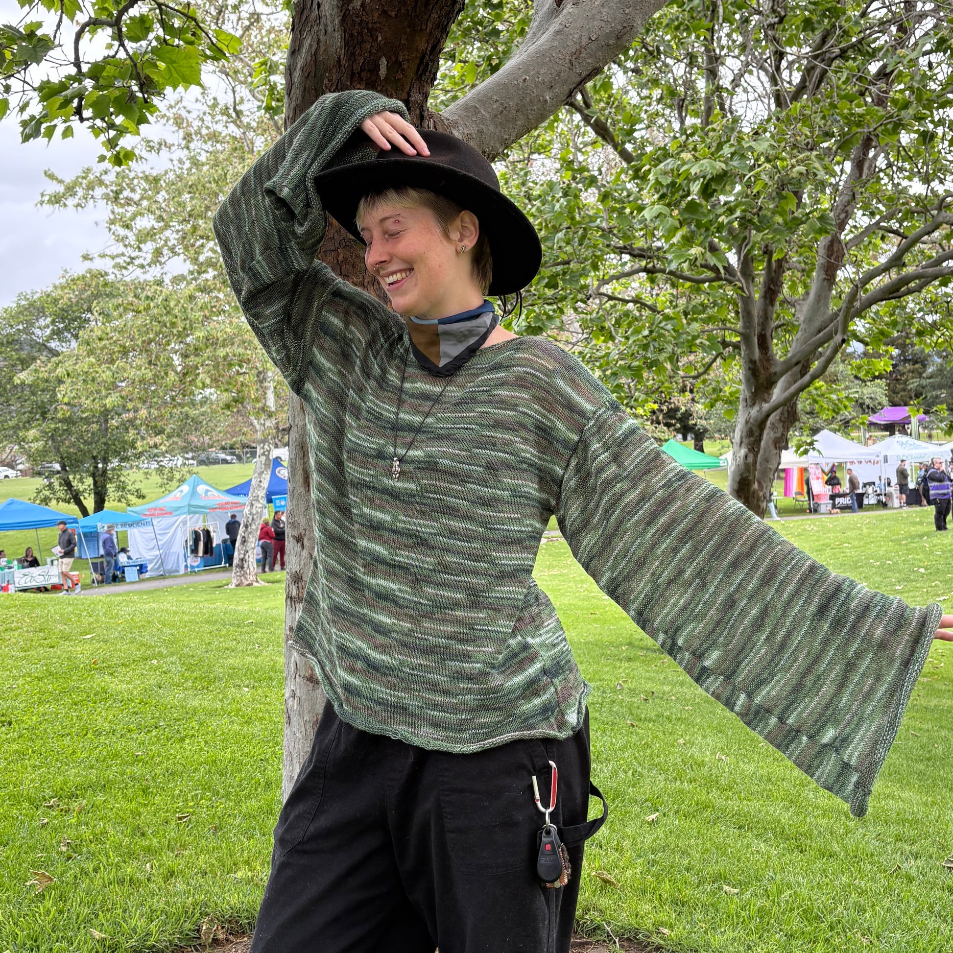 breathe in, breathe out, soak in the nourishing green forest feel of this soft wool longsleeve. knit with a mix of upcycled cotton, wools, this comfortable, stylish top is the perfect staple for any outfit. this top took about 14 hours to make.