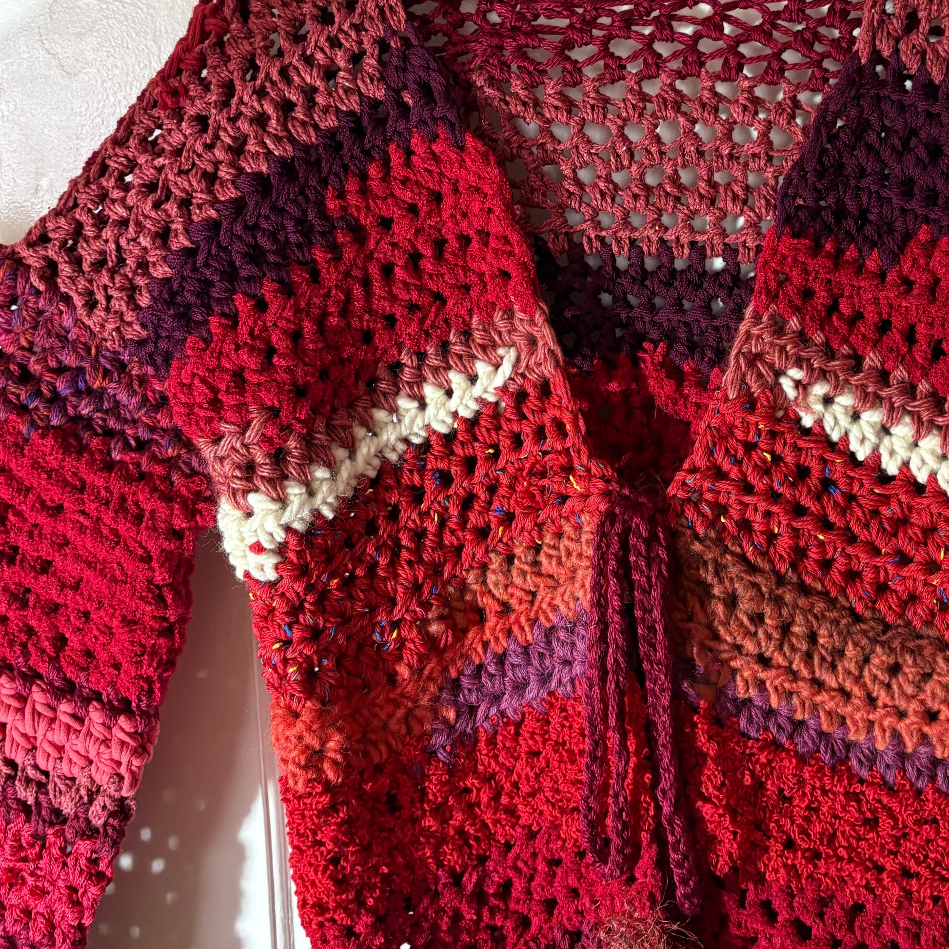 This one-of-a-kind cardigan is hand-crocheted using secondhand and thrifted yarns in rich, warm tones of cherry red, rust, maroon, rose, and plum. The sleeves flare out slightly at the cuffs, with contrasting color pops in mustard, gray, and coral. A hand-braided tie at the front allows for flexible styling—wear it loose and open or tied snug across the chest.